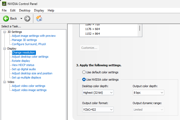 ☐ Set NVIDIA GPU to YCbCr422, Limited